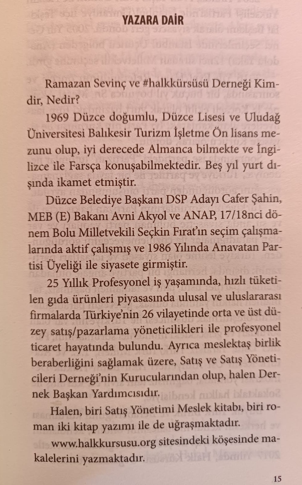 Bu kitap, Halk Kürsüsü Dernek Başkanı Ramazan SEVİNÇ’in 2020 – 2021 yıllarındaki gazetelerde de yayınlanmış şahsi fikirleri – makalelerinin toplandığı bir eserdir.